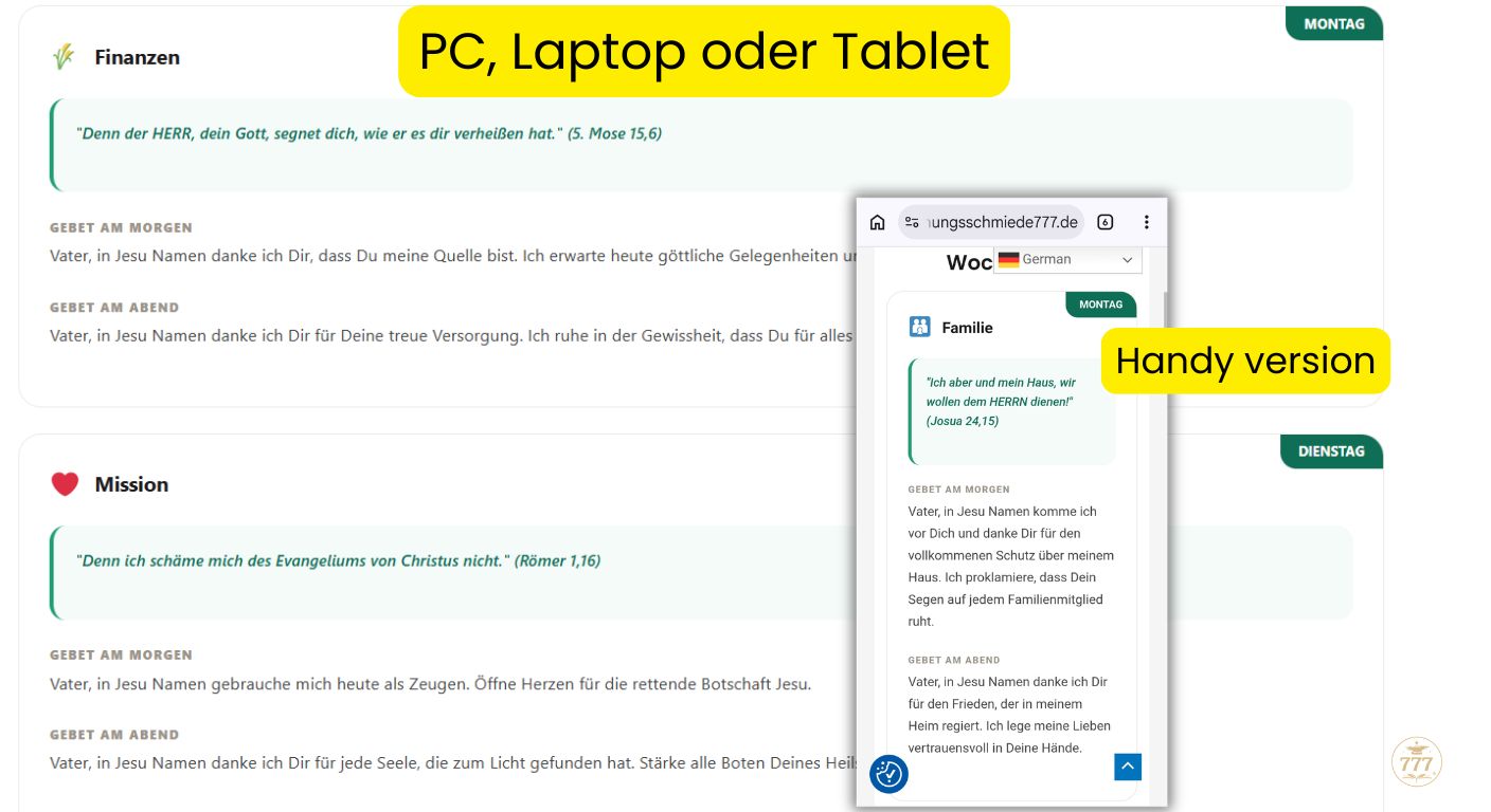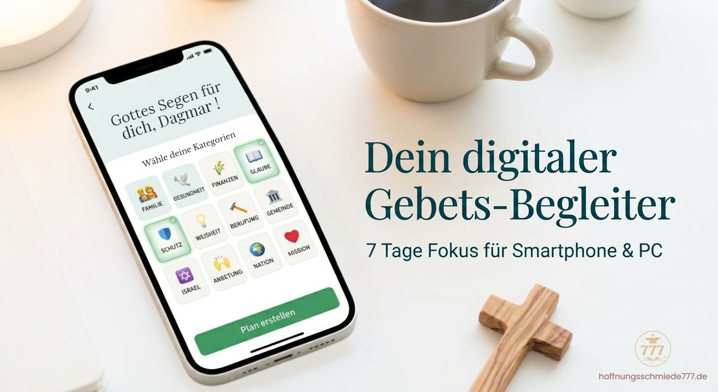 Der interaktive 7-Tage Gebets-Fokus der Hoffnungsschmiede 777 ist dein digitaler Begleiter, der biblische Wahrheiten direkt in deinen Alltag spricht.