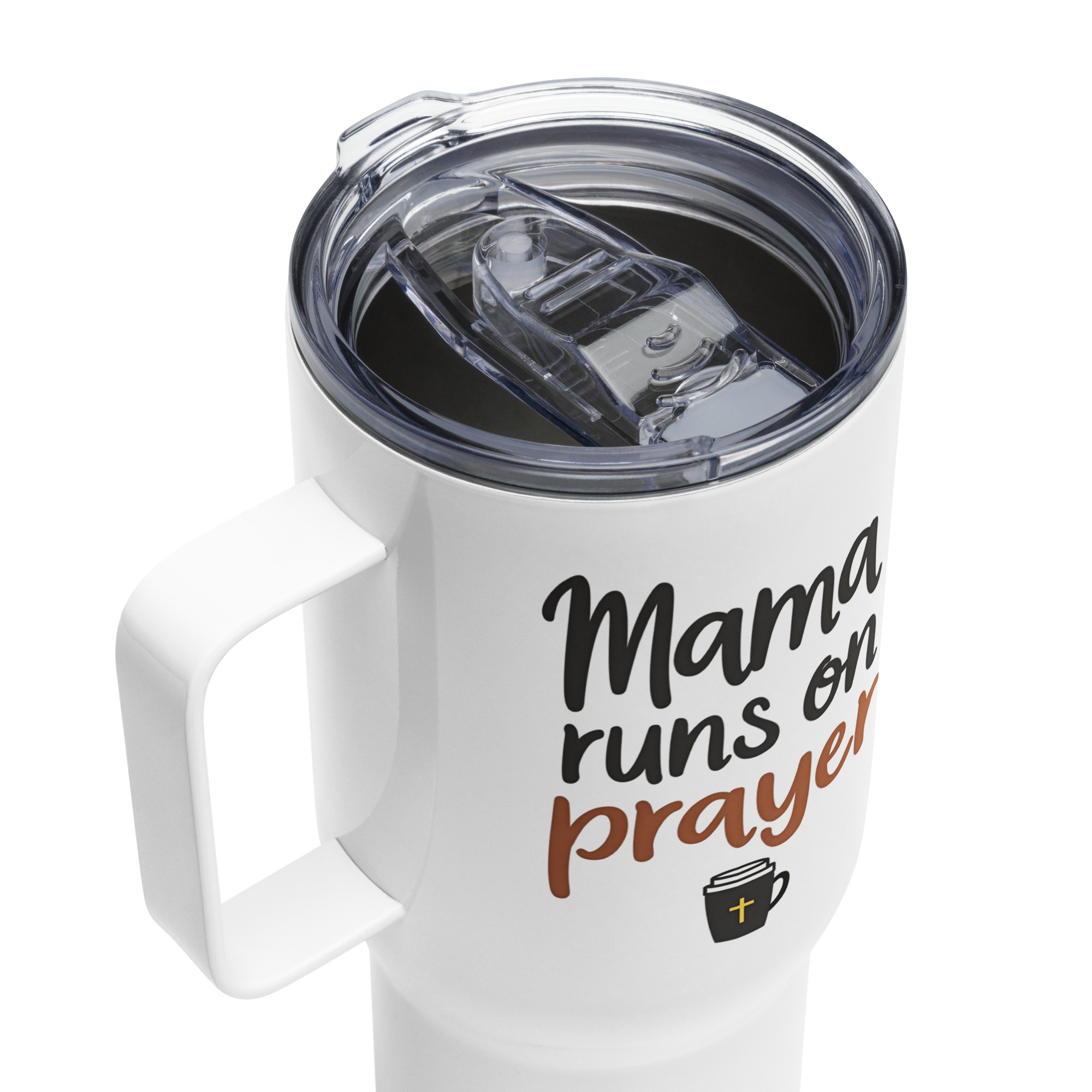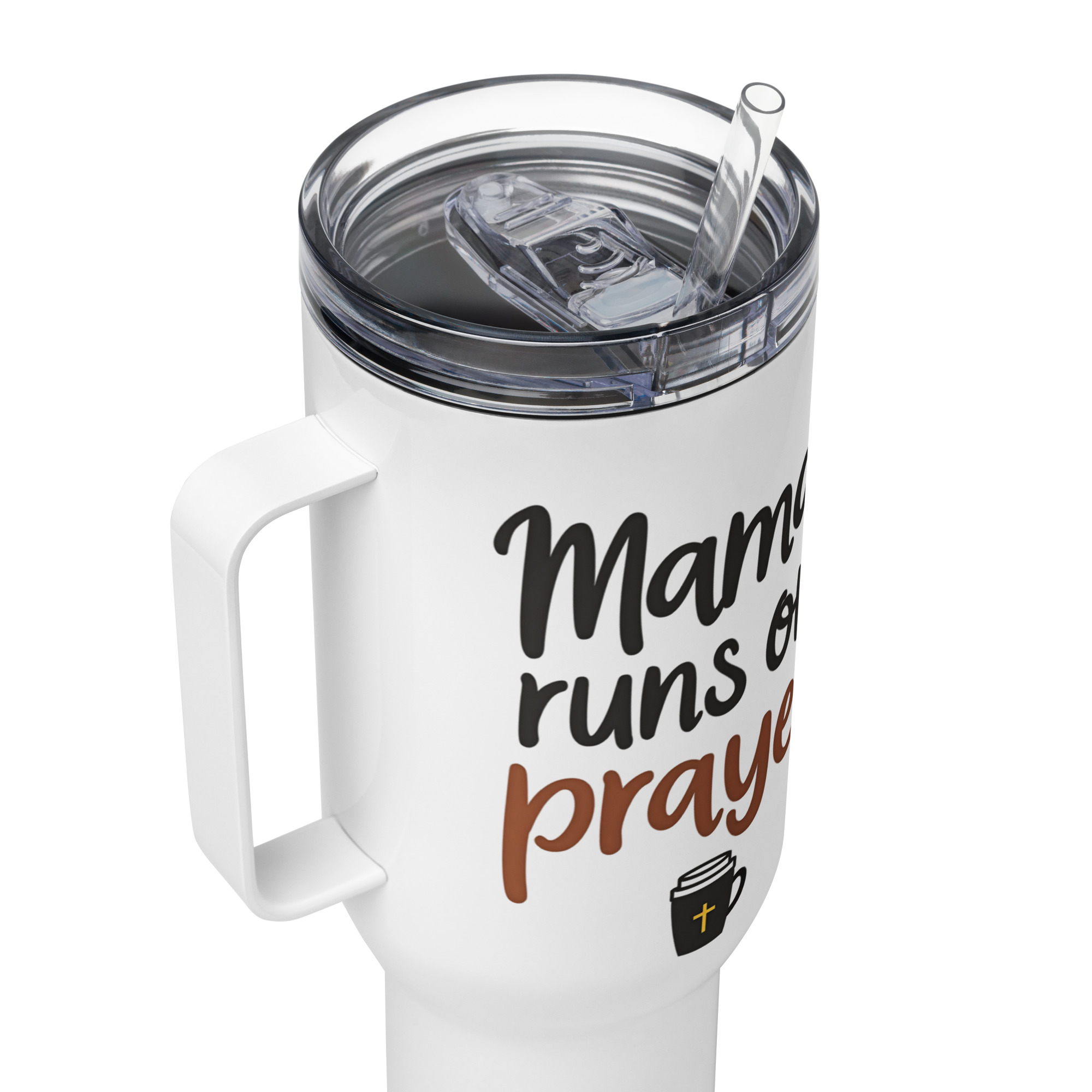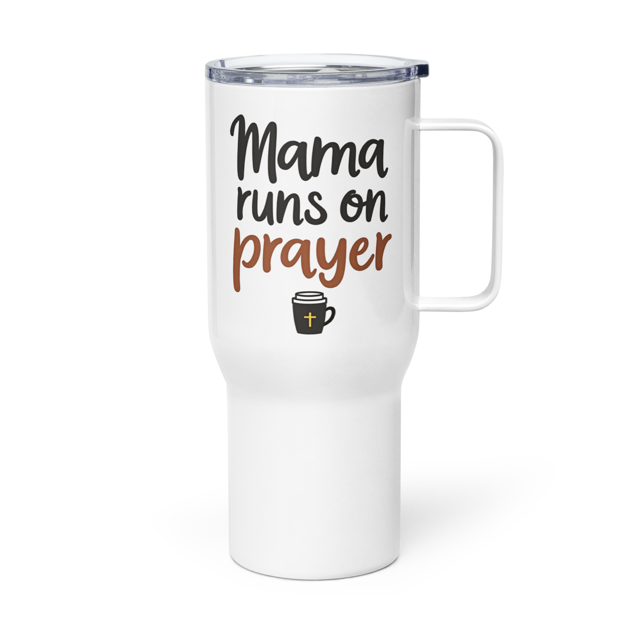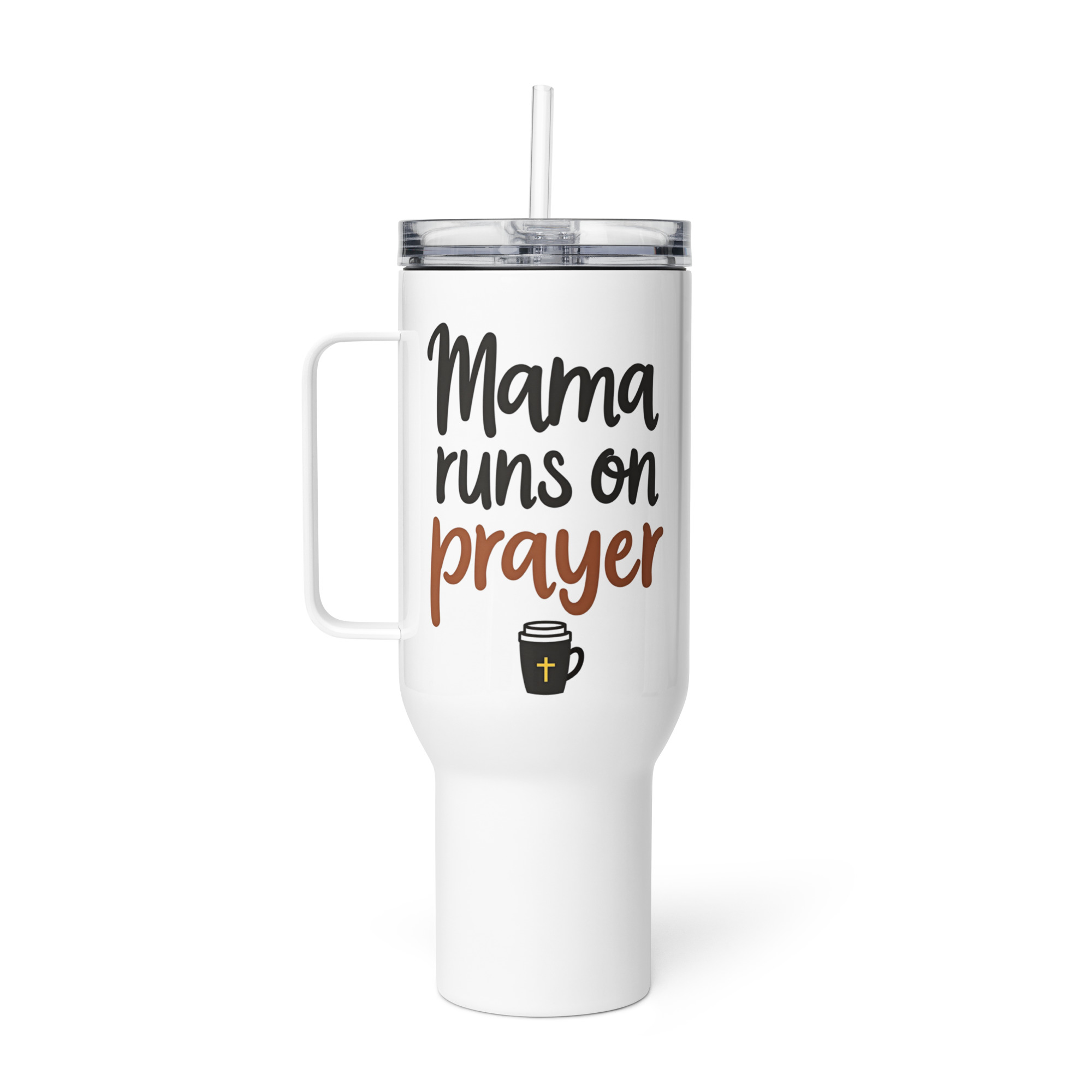 Kurz gesagt. Ein hochwertiger Thermobecher für Mamas, die wissen, woraus sie wirklich ihre Kraft ziehen, mit dem Spruch „Mama Runs on Prayer“ und Kaffee-Motiv.