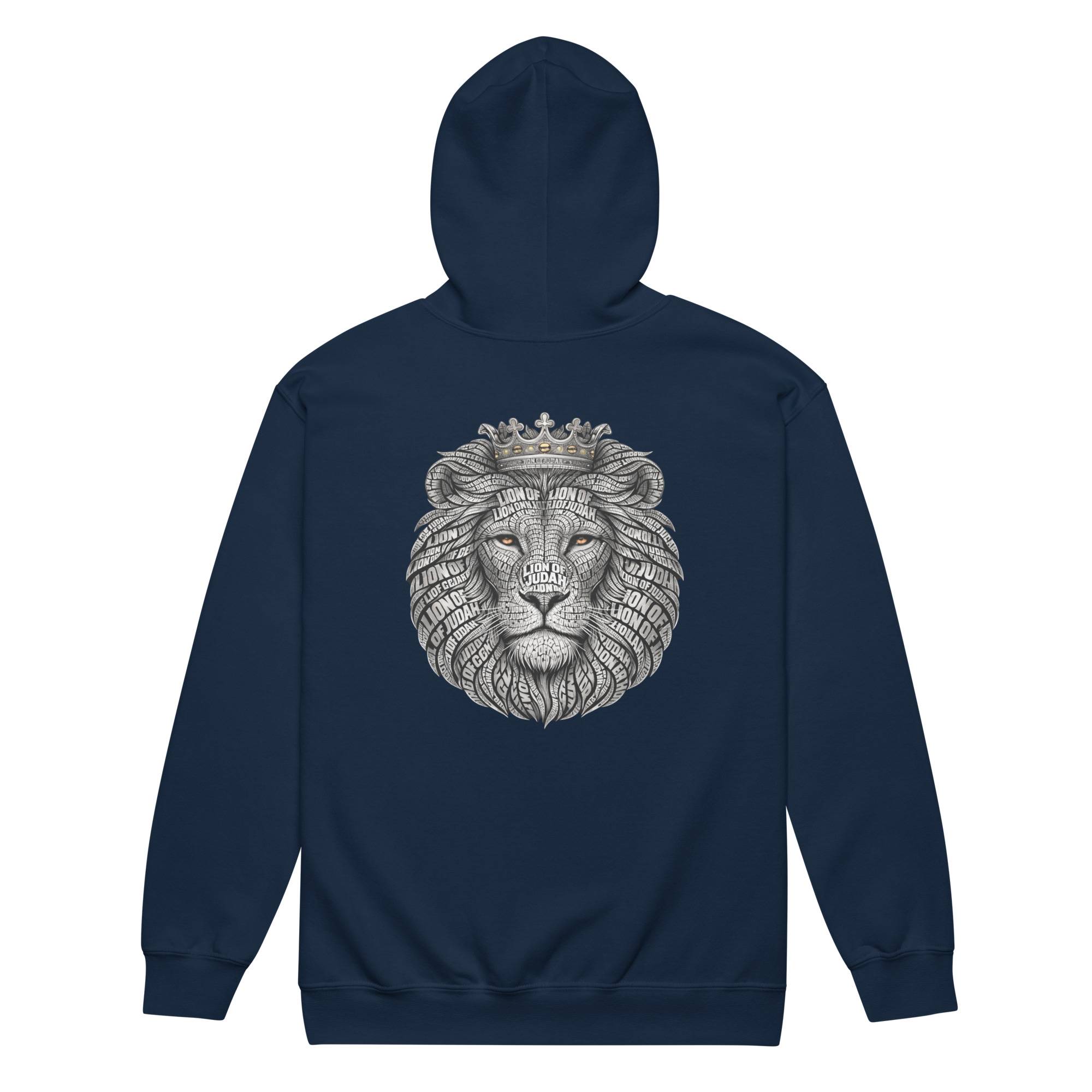 Dieser christliche Zip Hoodie trägt vorne „Lion of Judah“ als Frontprint und hinten einen gekrönten Löwen.